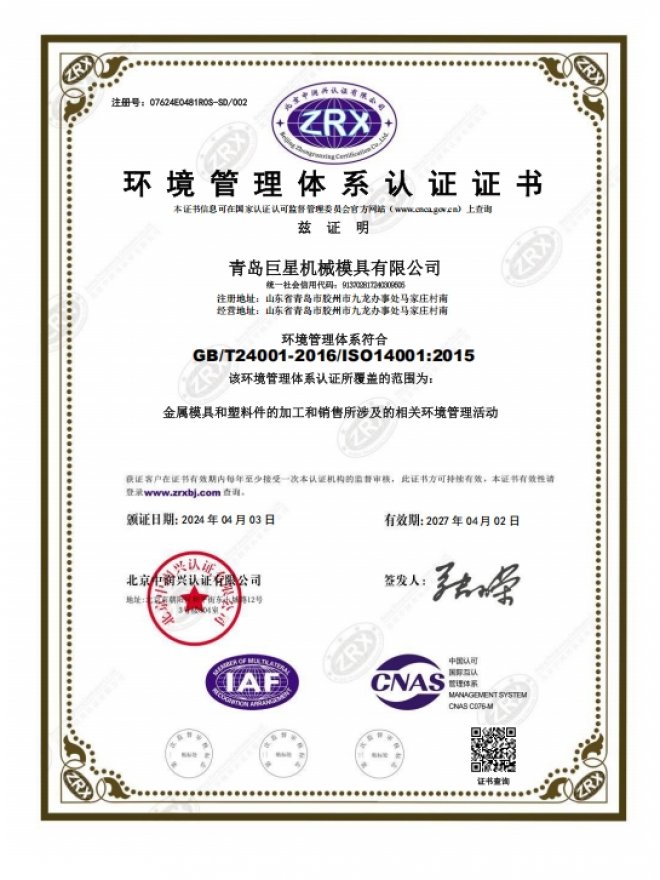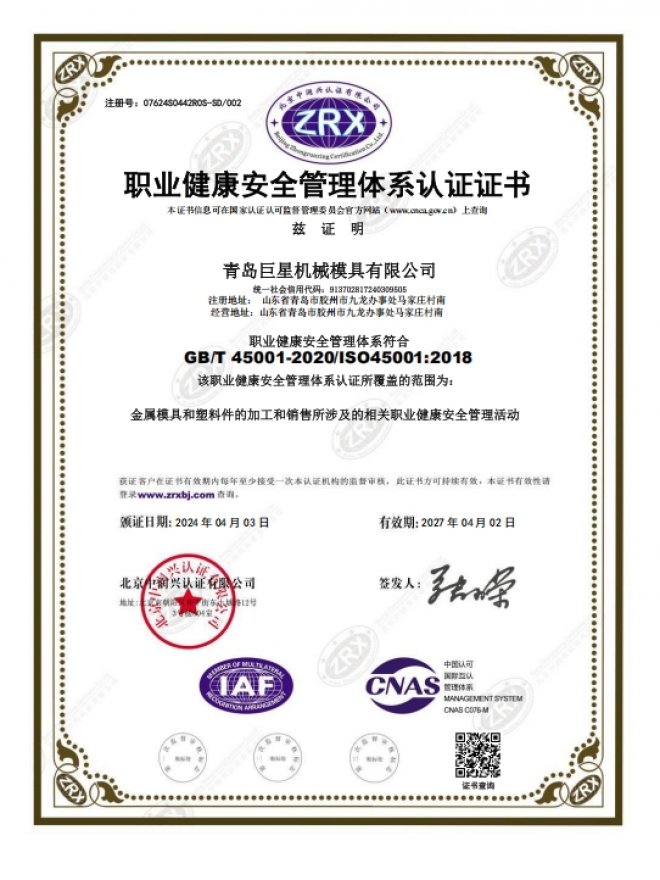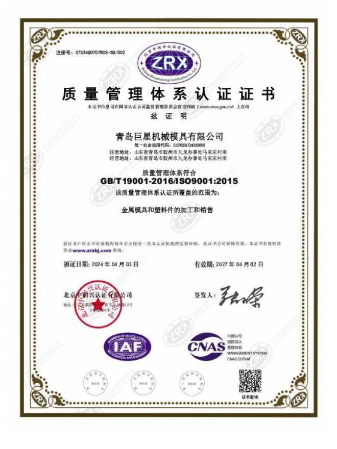 青島巨星機(jī)械模具有限公司位于美麗的膠州灣畔——青島市膠州市。成立于1995年。多年來一直致力于塑料模具,金屬?zèng)_壓模具,橡/硅膠模具,板片材擠出模具等模具的研發(fā)制造,并且配有塑料制品標(biāo)準(zhǔn)化生產(chǎn)車間,90T-800T各型號(hào)注塑機(jī)齊全,可為您提供模具研發(fā)與產(chǎn)品生產(chǎn)一站式服務(wù),本司已通過ISO9001質(zhì)量管理、ISO14001環(huán)境管理、ISO45001職業(yè)健康安全管理等體系認(rèn)證。目前已與美國(guó)通用汽車,韓國(guó)大宇造船、現(xiàn)代重工,俄羅斯,巴西,非洲等國(guó)家或地區(qū)的實(shí)力公司建立長(zhǎng)期合作關(guān)系。